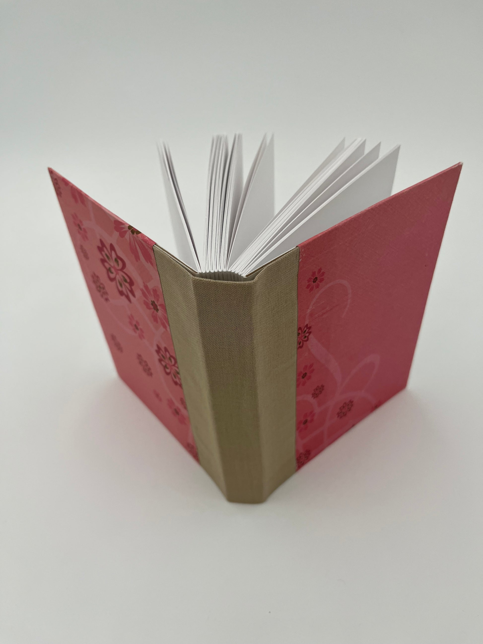 Open-spine style allowing the journal to lay flat. This one is 4.75”x6”. You can carry this one around in your backpack or tote or leave it beside your bed for those quiet musings at the end of the day. 188 pages, bright white paper, hand-sewn, quality paper for fountain pen or marker. The cover is rose-pink with a minimalistic floral motif. The spine is covered in a soft beige, complementing the rose-pink.
