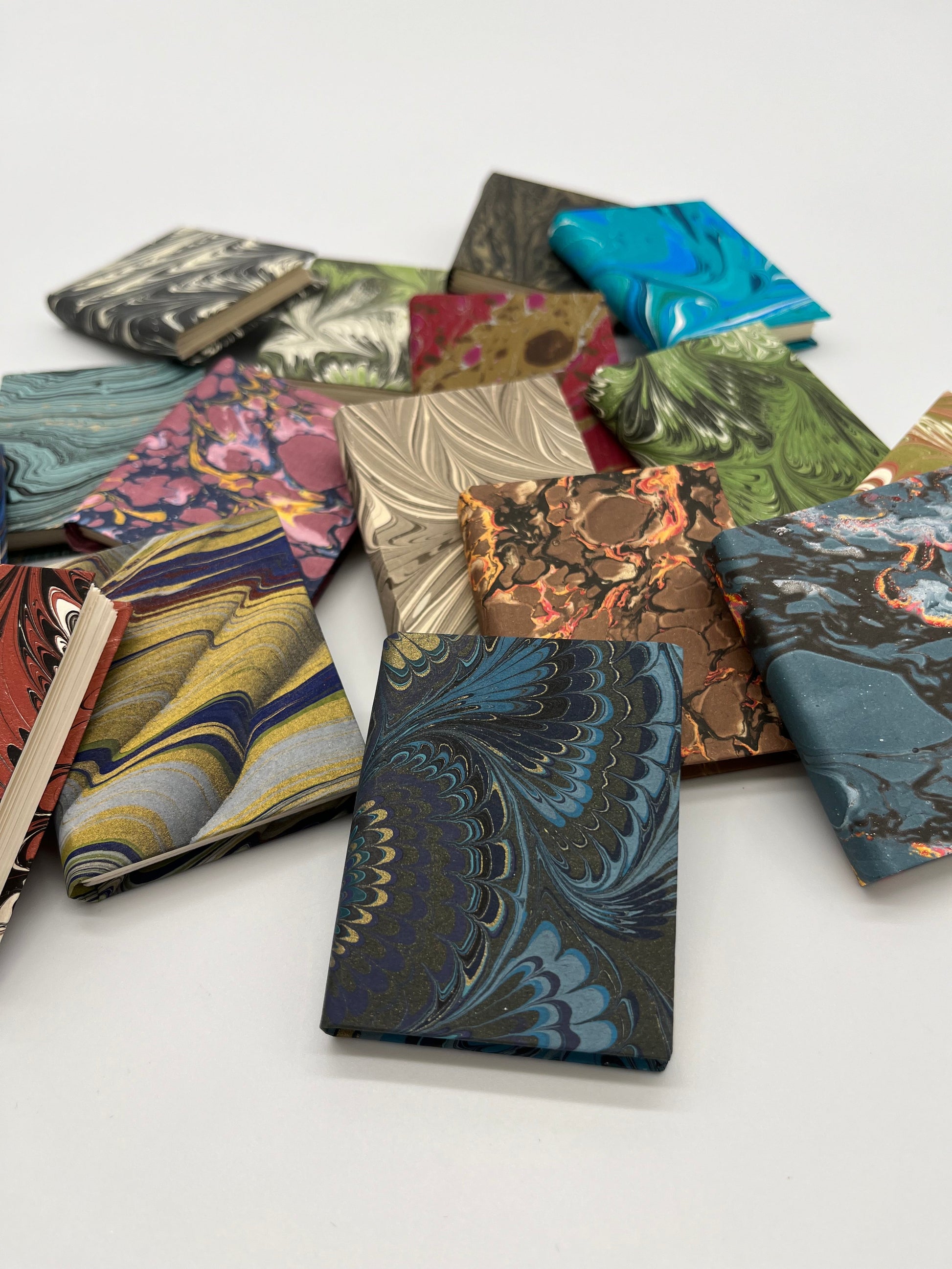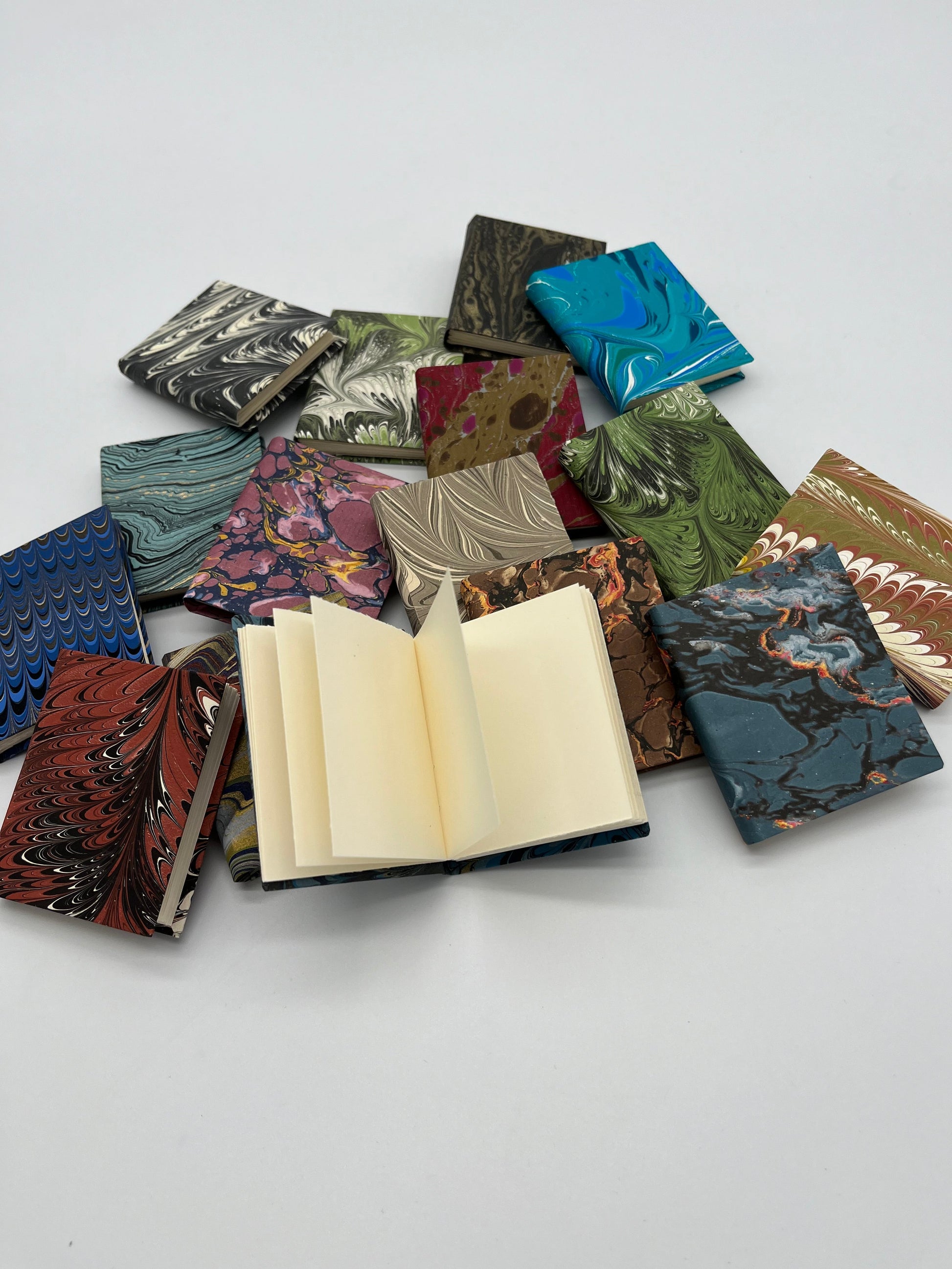 This 100% handmade, 2"x2.5" journal features 38 pages of rich, hand cut paper. The hand sewn and assembled cover features a unique marbled brown stone pattern. Perfect for storing thoughts and memories to reflect on for years to come.